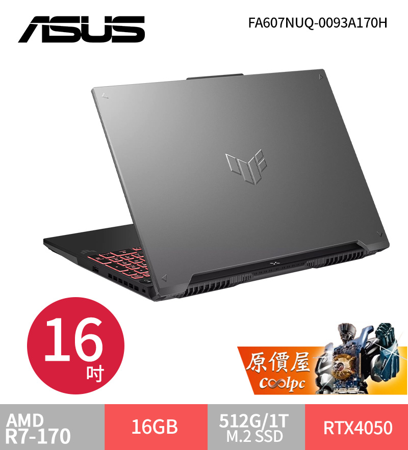 華碩 TUF R7-170/RTX4050/16G/512G/16吋 月影灰 FA607NUQ-0093A170H $37999>蝦皮商城>官網