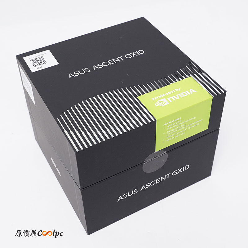 華碩自製版的 Ascent GX10 (NVIDIA Spark DGX GB10) AI 超級電腦,外盒採用黑、白配色,配上波浪線條的造型,看起來很像主機會出現的圖案。
