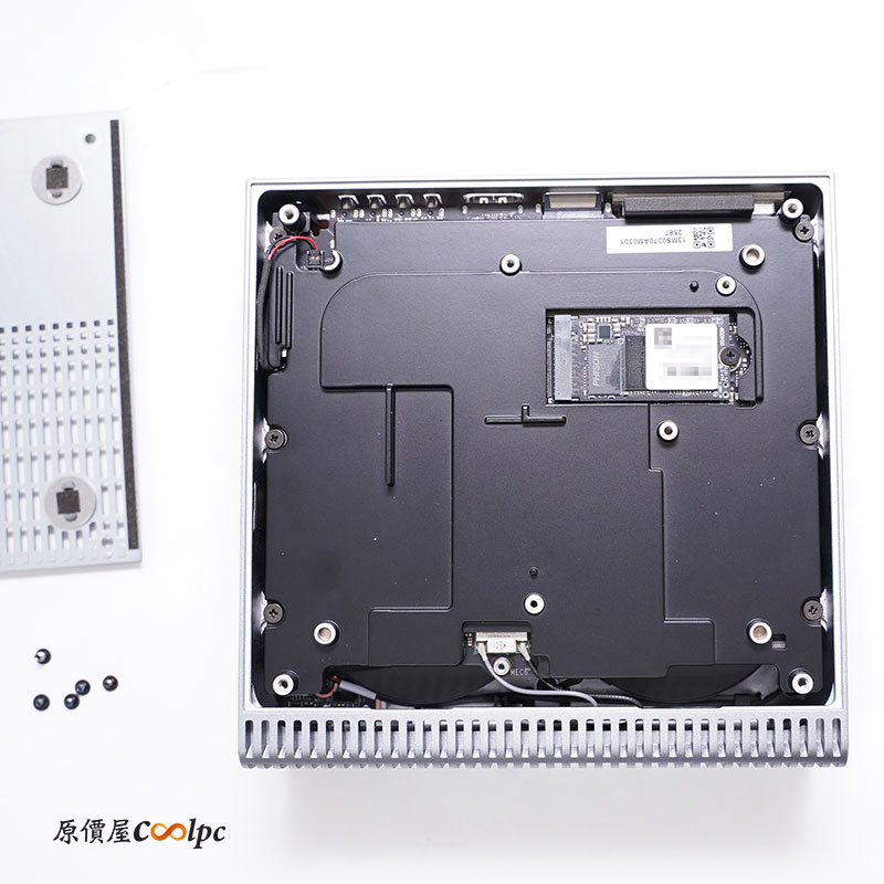 拆卸底部螺絲後,SSD 上方還會有一塊檔板,使用的 SSD 規格是 2242,購買時的容量若已滿,可以自行購買升級,官網上也有系統可以下載自行安裝(點我查看)。