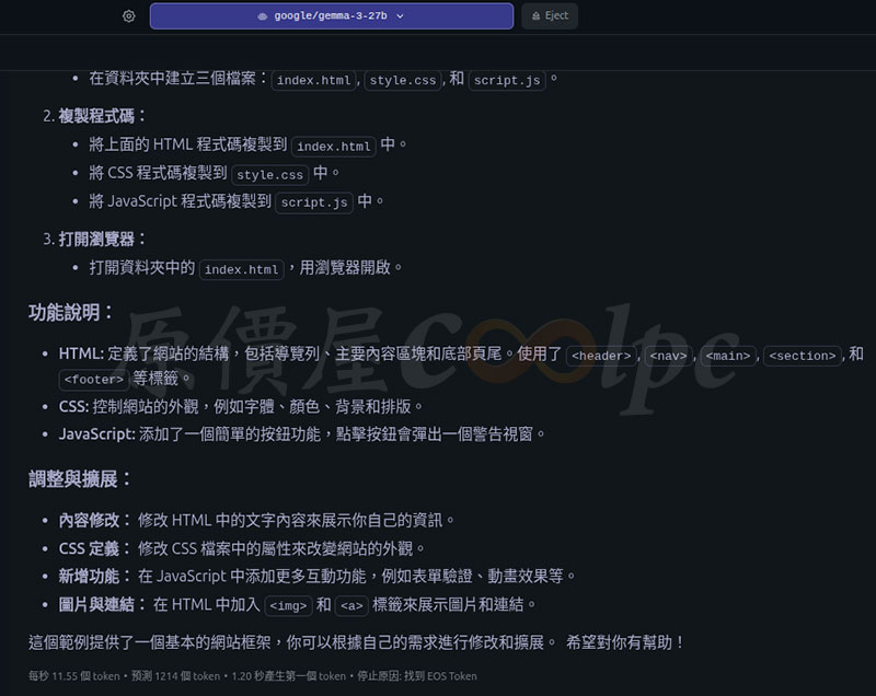 Google gemma-3 27B 參數模型獲得每秒 11.55 token,預測 1214 token、1.20 秒產生第一個 token。