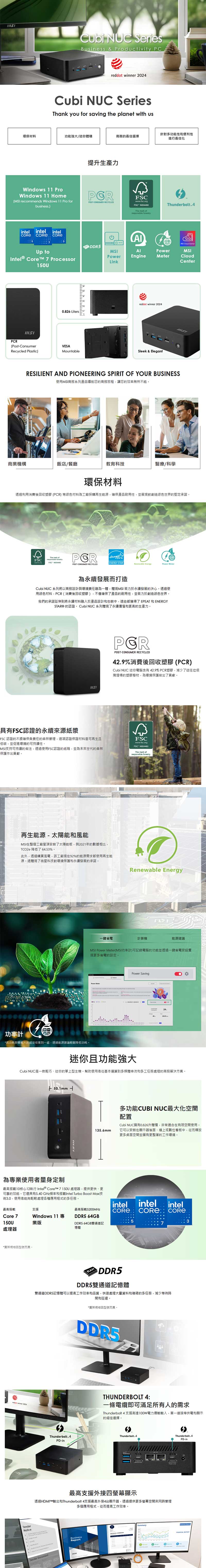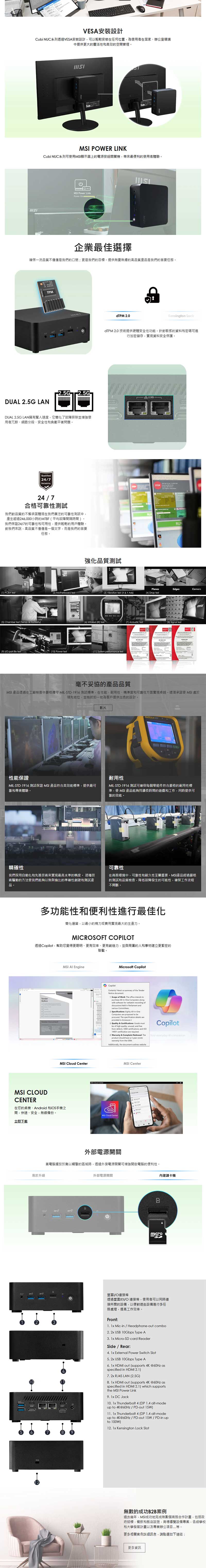 值得一提的是 Cubi NUC 1M【039BTW】 I/O 資源超豐富!前+後 2 x Thunderbolt 4(一組支援 PD-in 100W / 4K 顯示)2 x HDMI 2.1(一組支援 MSI Power Link),總共支援最多 4 螢幕。其餘介面還有 4 x USB 10Gbps Type-A、雙 2.5G LAN、Wi-Fi 6E + BT 5.3、Micro-SD 讀卡機、Kensington 鎖、延伸 Power SW(選配),萬分用心!不愧是獲得 Red Dot 紅點設計大獎的產品!不論你是文書工作者(多開報表、會議軟體)、創作者(剪輯影片、設計圖稿)、家庭用戶(影音中心、親子學習)、店家老闆(櫃檯看板、24/7運作),甚至教育體系也滿適合的,重點它還省電、無噪音、支援 VESA 100 x 100mm壁掛,應用範圍更廣!