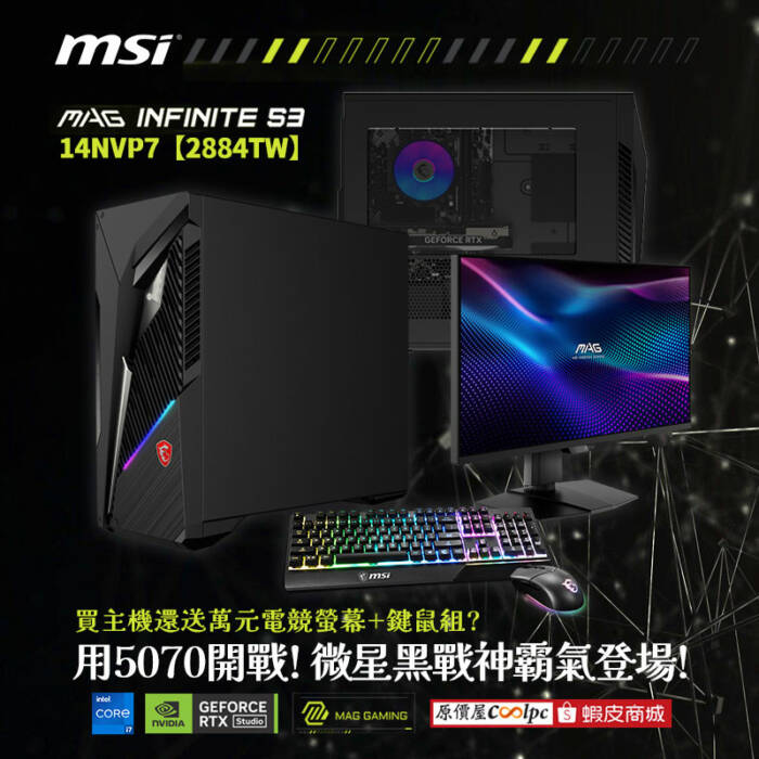 「MSI MAG Infinite S3 14NVP7【2884TW】」是微星定位為中高階玩家戰力的機種。搭載 Intel Core i7-14700F 處理器,搭配高速 32GB DDR5 記憶體。也配備 NVIDIA GeForce RTX 5070 顯示卡,提供強大遊戲與光線追蹤效能。儲存配置為 2TB 的 PCIe NVMe SSD,可快速讀寫大型遊戲檔案與資料。機身結構與擴充性方面,Infinite S3 採 ATX 機殼設計,尺寸為 173.8 × 446.97 × 407.17 mm,淨重約 7.73 公斤。它還支援 Wi-Fi 6E + Bluetooth 5.3 無線連接與 Intel I219V 有線網路卡。供電方面使用 850W、80 Plus Gold 規格電源供應器。冷卻系統採用風冷設計,搭配 MSI 的 AI 散熱演算法與分區氣室設計,以優化氣流與降溫效能。此外,主機還搭載 RGB 燈效與透明側板,可以展示內部硬體與個人風格,也可透過軟體 Mystic Light 來做燈效調整。整體而言,這次活動的主角「MSI Infinite S3 14NVP7【2884TW】」是一台集效能、散熱與擴充為一體的電競桌機,非常適合希望跳脫中階,直奔高畫質、高效能遊戲體驗的玩家朋友!