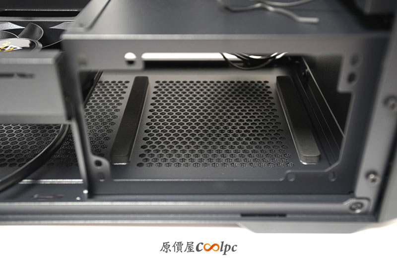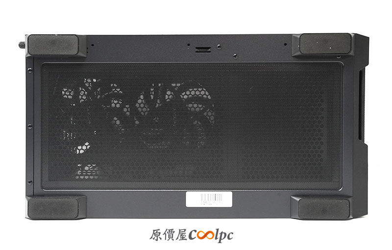 機殼底部有設置 4 個腳柱,提供了底部的散熱循環空間。也有散熱網孔設計。