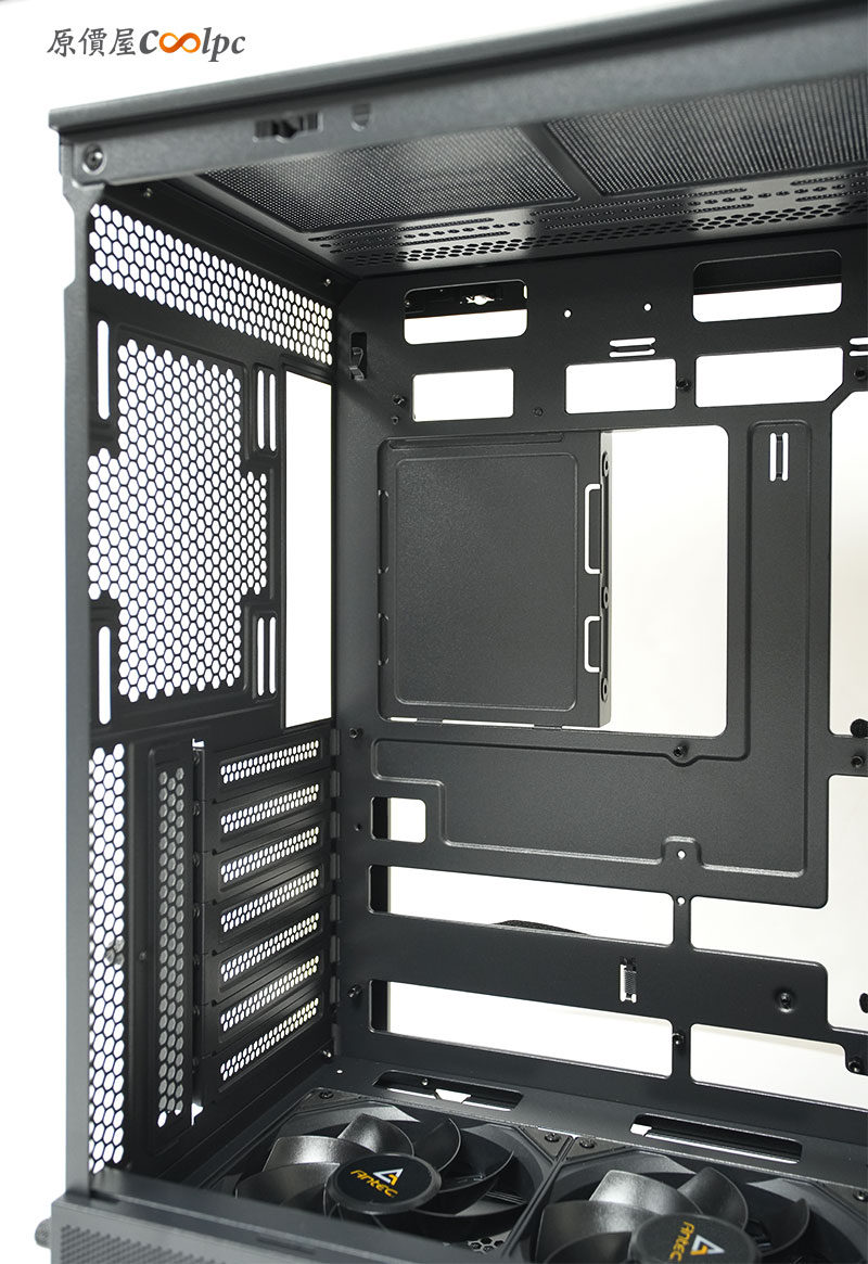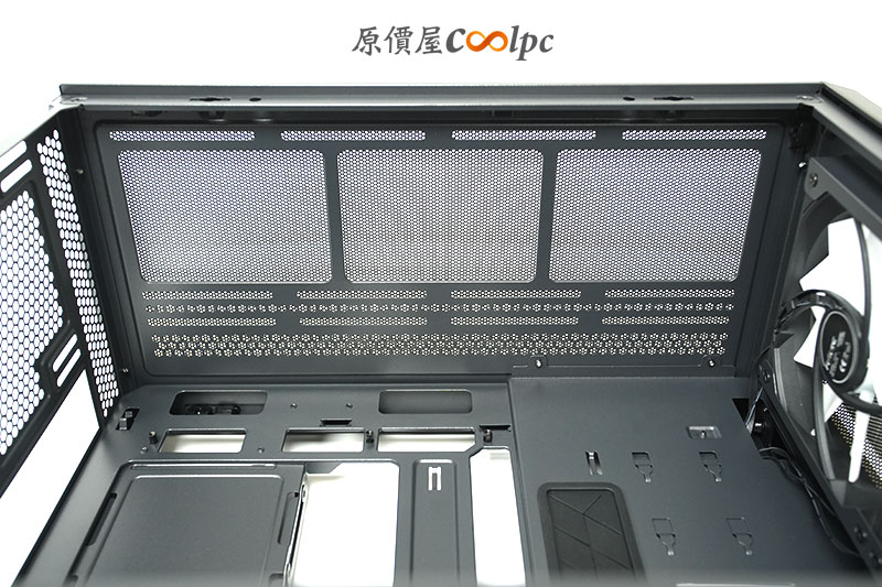 來看看內部結構一覽。先打開前面的玻璃側板後,可以看到寬敞的內部空間與分艙設計。提供最大 ATX 規格的主機板安裝位置,也支援 BTF 背插式主機板。下方則是電源艙的設計,可以取下網孔遮罩來方便操作電供的安裝。