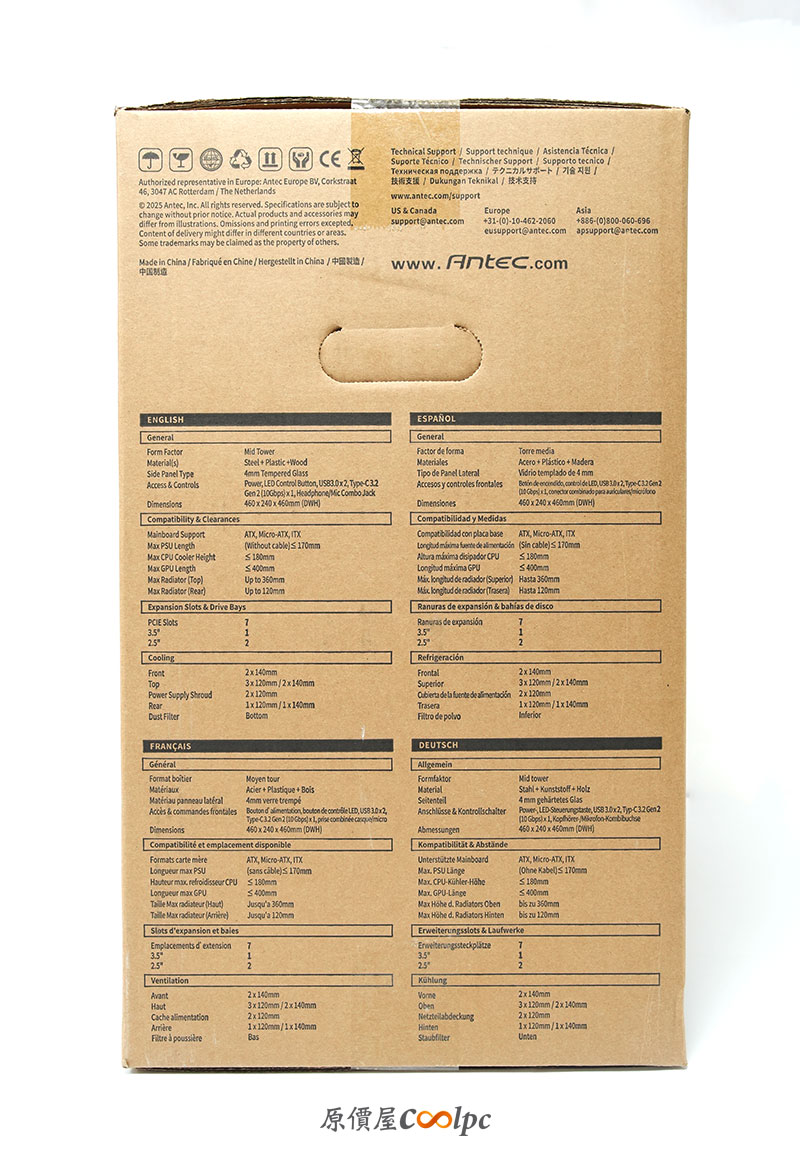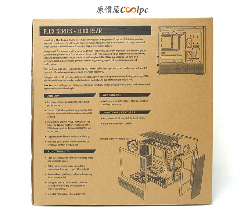 背面與側邊可以看到產品特色說明,包含 F-LUX 風流設計與風扇配置資訊,讓人一眼就知道這咖主打「散熱性能」。也提供完整規格,包含支援主機板尺寸、顯卡長度與水冷排支援等資訊。