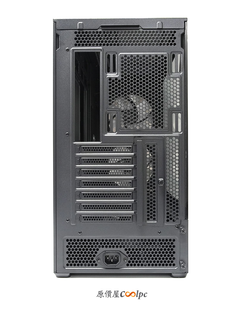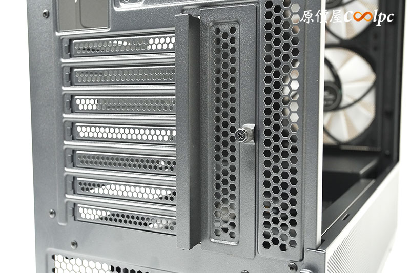 背面(後端)的設計有 7 條 SLOT 以及直立顯卡的安裝架,也有提供一個 120/140mm 的風扇安裝位置。與傳統比較不同的地方則是下方有延伸電供接線的延伸插座。因為「Antec FLUX REAR」採用的是將電供設計在靠前面板的位置。