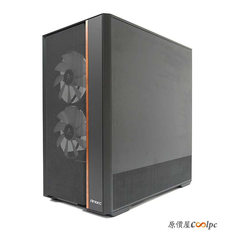 機殼本體外觀設計,可以看到整體為中塔尺寸,比例修長,第一印象是偏向「性能取向」。前側邊採用強化玻璃設計,內部零件一覽無遺,適合 RGB 玩家展示配置。後側邊則是全封+下半部網孔側板設計。