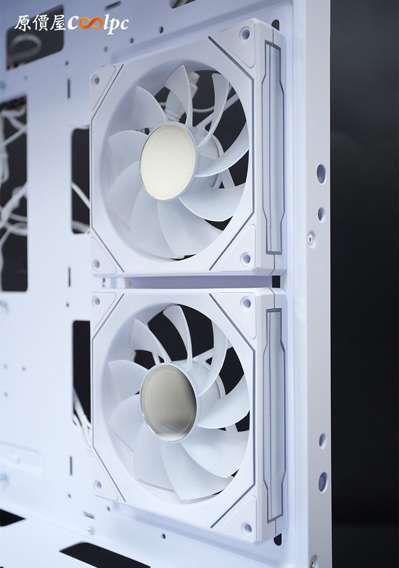 側邊兩顆菱鏡120mm ARGB風扇,特別採用反葉扇設計,進氣同時保留最佳燈光效果。