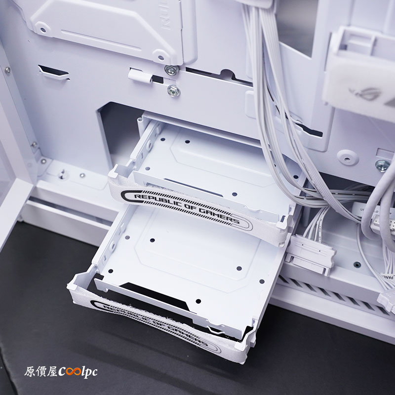 背面內部壓克力遮線蓋和魔鬼氈一樣走一個全白色系,左邊四個 2.5 吋 HDD/SSD 擴充支架,底下則是兩個 3.5 吋 硬碟擴充架。