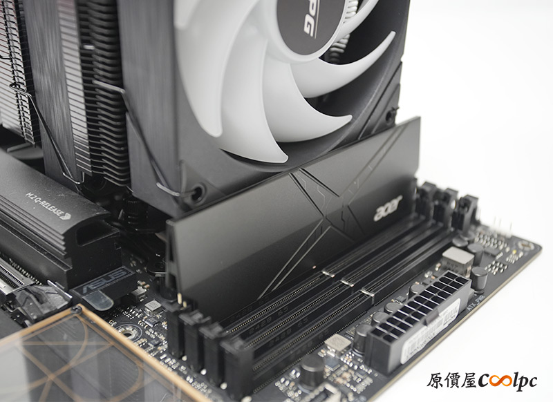 裝上主機板後,可以明顯看到偏移設計大成功,散熱器完美避開RAM插槽,如果RAM有RGB燈光也完全不會遮擋喔。