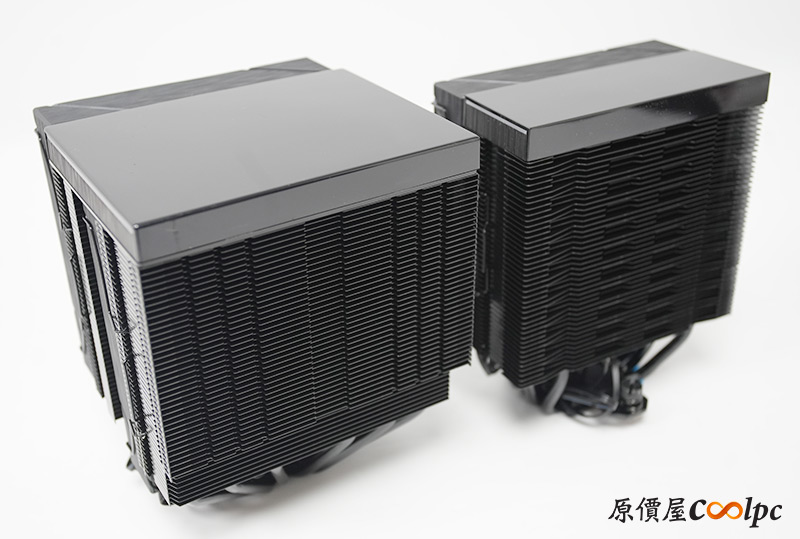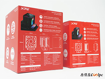 先來看一下XPG MAESTRO PLUS 62DA與42SA的主要差異,最明顯當然是62DA擁有雙塔雙扇,散熱鰭片面積與數位顯示面板都更大,還有六支直觸式熱管散熱。而42SA則是單塔單風扇,散熱面積與數位面板相對小,熱導管也減少為四支,其他地方兩者設計大致是相同的。