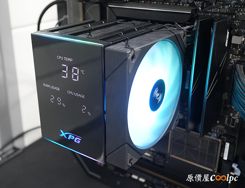 開機後要先到官網下載XPG PRIME軟體並開啟,否則散熱器上的數位面板不會有畫面喔。顯示的內容有CPU溫度、CPU使用率、RAM使用率,平時透過機殼玻璃側板就能直接看到運作狀況,並且面板上下兩側、XPG字樣、風扇都有ARGB燈效,透過主機板軟體就能和其他裝置同步。