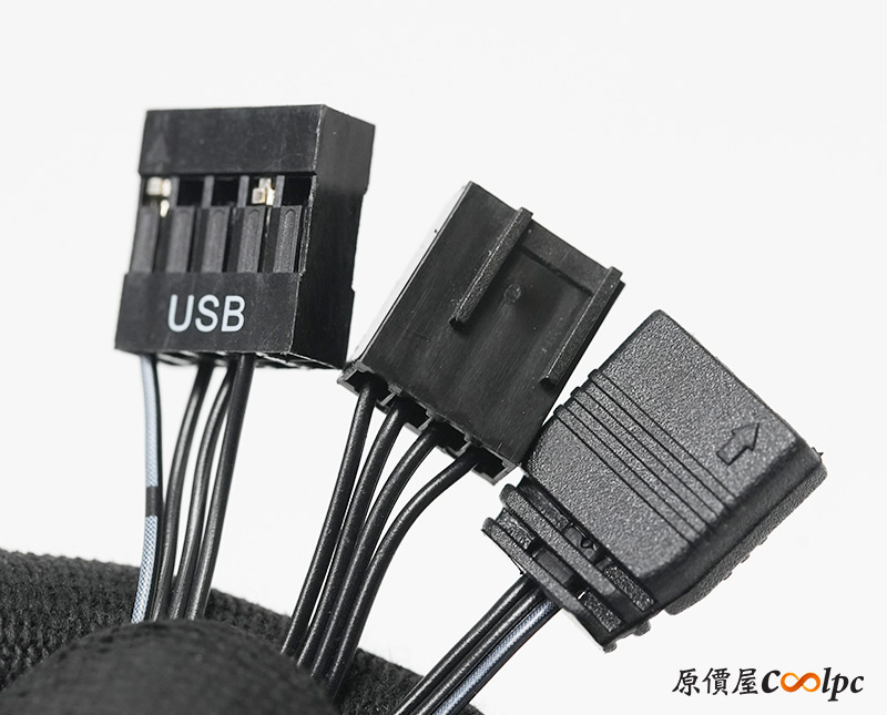 供電使用小4Pin介面,燈光是3Pin 5V RGB,數位面板則是USB 2.0 9pin。
