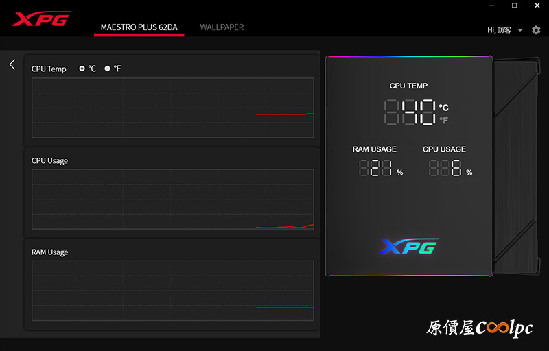 開機後ARGB燈光和數位面板同時亮起,MAESTRO PLUS 42SA同樣可以顯示CPU溫度、CPU使用率、RAM使用率,不過呈現方式簡化不少,而且是將前面三種狀態輪播,資訊都集中在面板中央,撇除這點就和62DA大同小異,XPG LOGO與面板上下緣都有ARGB燈效,就是整體面積變小了而已。