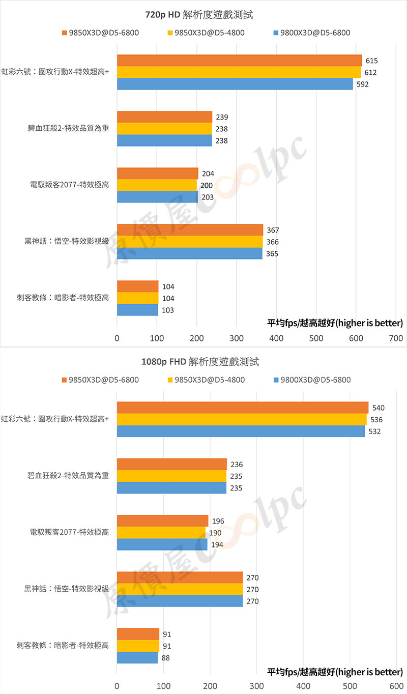 遊戲基準測試,針對 720p、1080p,平均 fps 越高越好!從測試結果來看,9800X3D 和 9850X3D 的性能差異確實不大,同時我也測試了 DDR5-4800 和 DDR5-6800,以 9850X3D 來說確實是無關記憶體時脈,遊戲表現都很優秀。礙於時間關係,未來有機會再多測試 1% Low、0.1% Low fps 給各位參考。