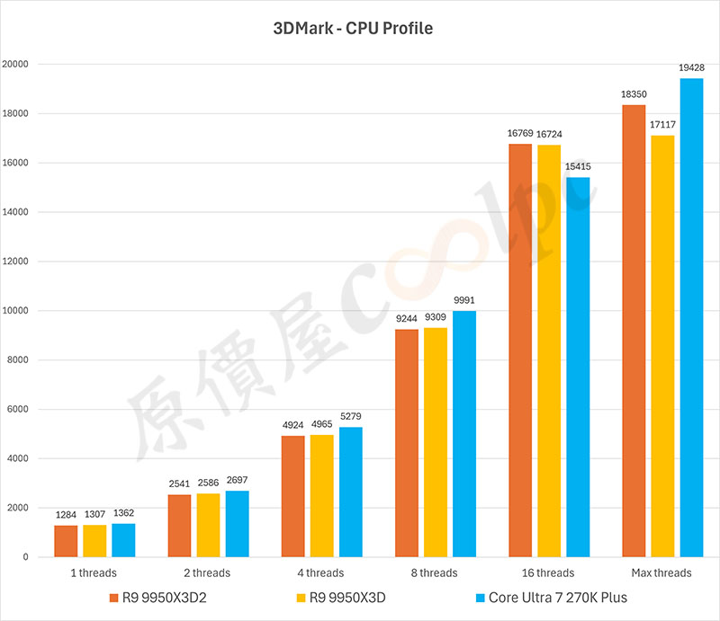 3DMark CPU Profile 主要測試 CPU 1/2/4/16/Max 執行緒性能,測試效能數字越高越好。反映處理器從單核反應到多核爆發的效能伸縮性,直接對應 3A 大作在高負載與多工環境下的穩定幀數上限。