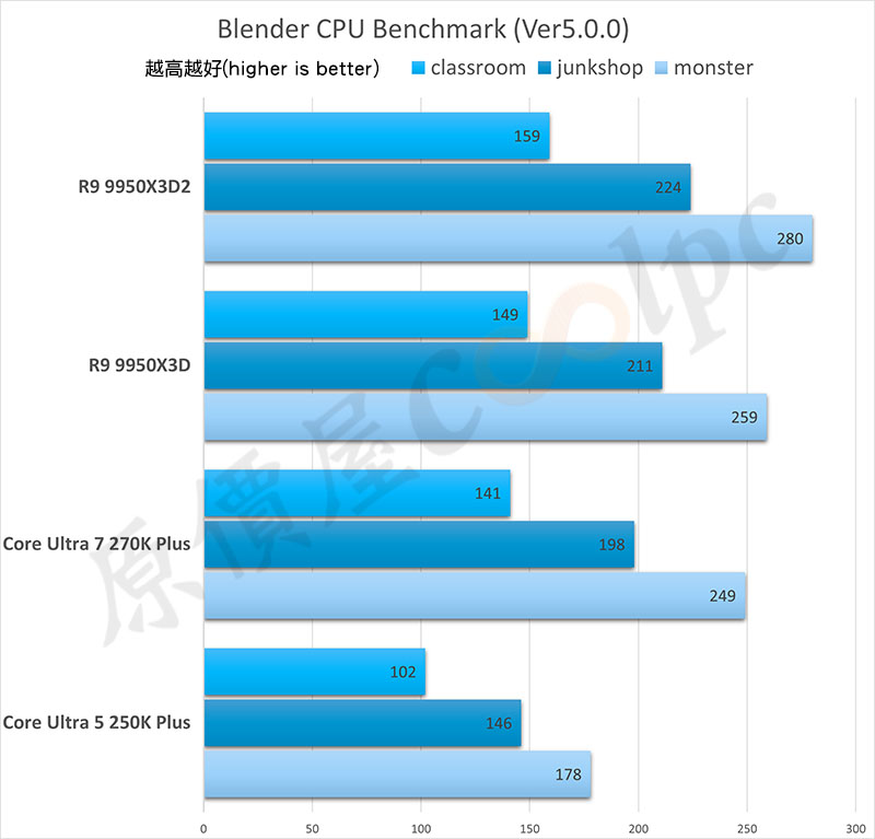 Blender 測試 CPU 渲染性能,數字越高越好。模擬專業 3D 工作流中的幾何運算,分數越高代表在進行複雜建模、紋理貼圖或即時畫面操作時,反應越敏捷不卡頓。