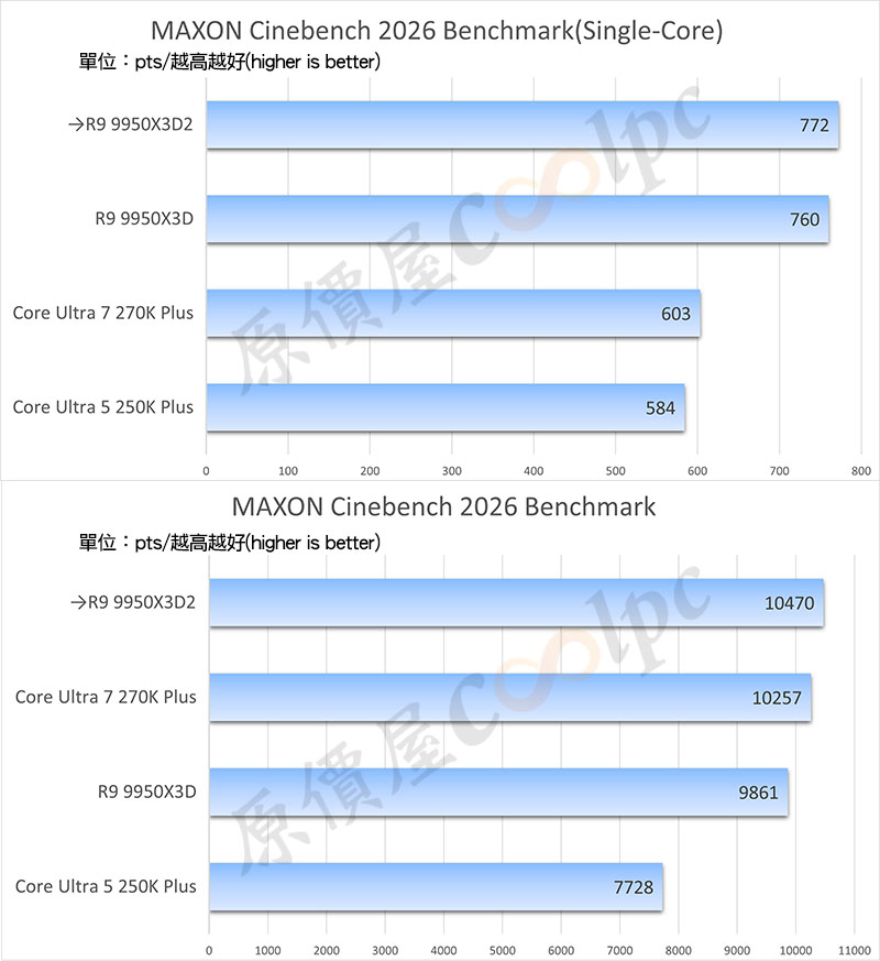 CINEBENCH 2026 主要測試 CPU 渲染性能,測試效能數字越高越好。目前最具權威的重負載生產力指標,模擬電影級光影運算,分數越高代表專業 3D 渲染與影視後期的等待時間越短。
