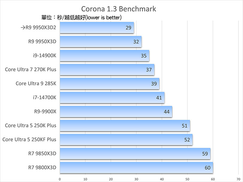 Corona 1.3 軟體主要針對 CPU 渲染性能做測試,數字越低表示速度越快。專測處理器在照片級寫實渲染下的執行效率,是建築設計與工業建模領域評估結案速度的直觀指標。