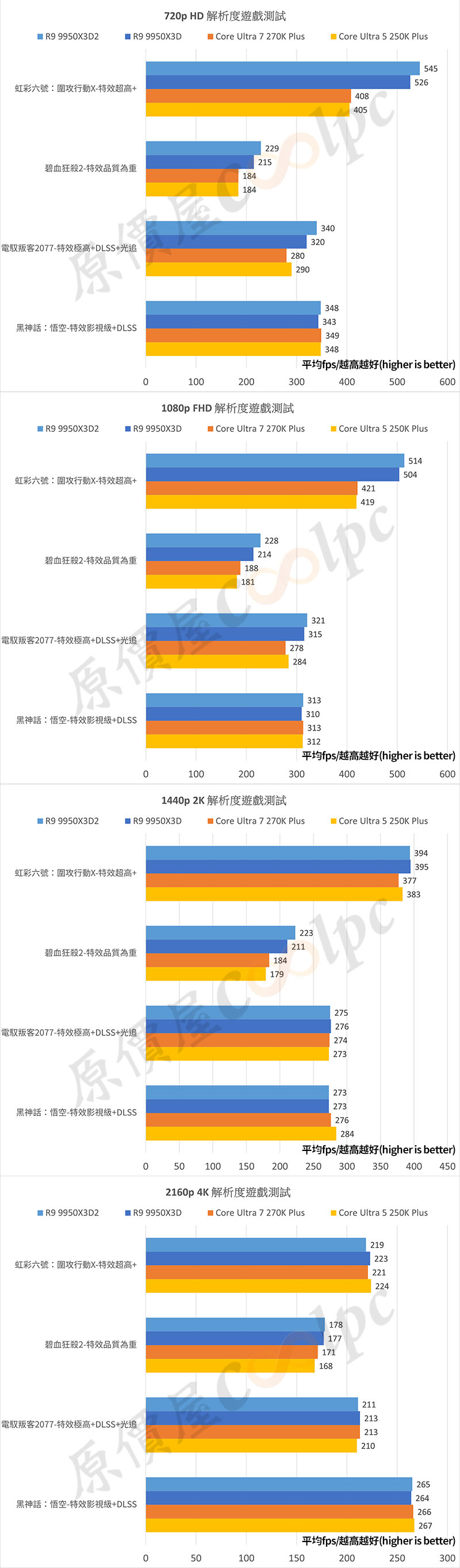 遊戲基準測試,針對 720p、1080p、2K、4K 表現進行測試,平均 fps 越高越好!