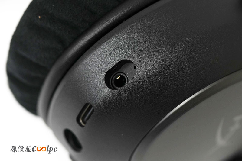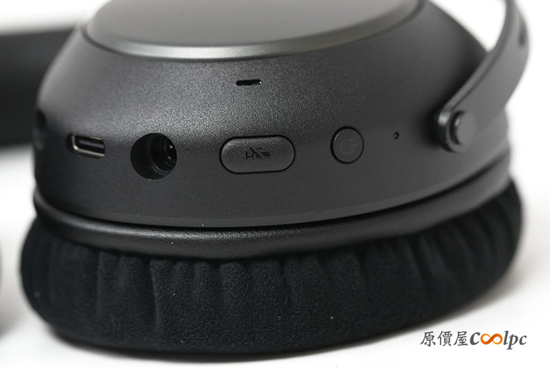 操作按鍵與接孔分布設置在兩邊的耳罩側邊。包含藍芽/2.4GHz 的模式撥鍵、音量滾輪、麥克風監聽。