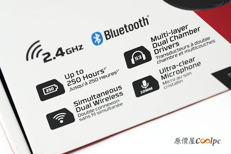 左下角有產品特色一覽。清楚列出重點規格,包含 250 小時續航、招牌雙腔體設計、無線連線優勢等,讓你在開箱前就知道這副耳機的定位不是入門,而是直衝高階。