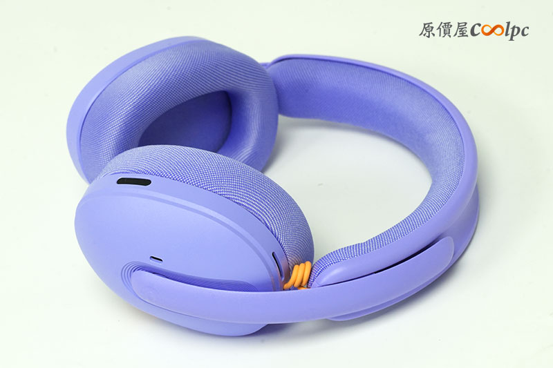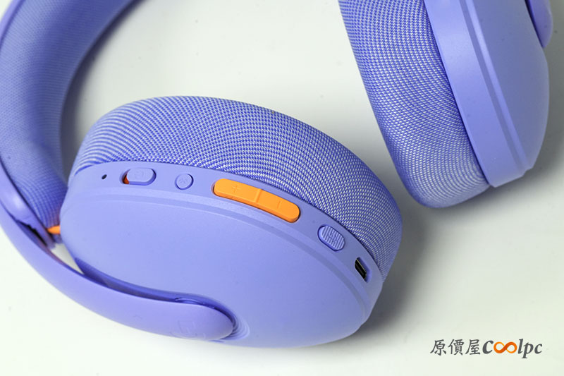 耳機的操作與主控配置在耳罩的側邊。除了有開關撥鍵,還有藍芽鈕、音量調節鈕,以及麥克風的開關鈕。另外還有 TYPE-C 的接埠,提供線材的充電。