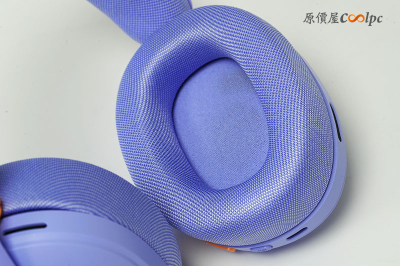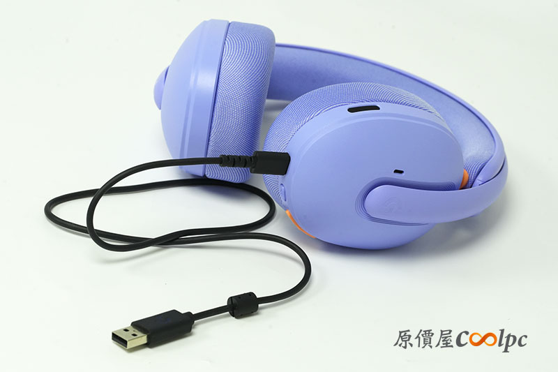 來看看耳機本體外觀。這次開箱我們以「丁香紫」款為主要。外型相當吸睛,搭配橘色細節點綴,整體更偏生活風格,不只電競也適合日常使用。