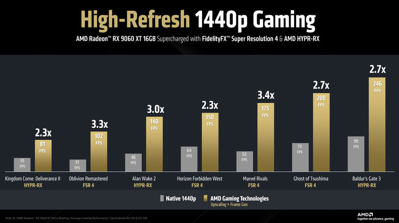 RX 9060 XT 16GB 2K遊戲搭配上 FS4 技術或 AMD Hypr-RX 功能,遊戲的幀數表現最少都有兩倍以上提升。