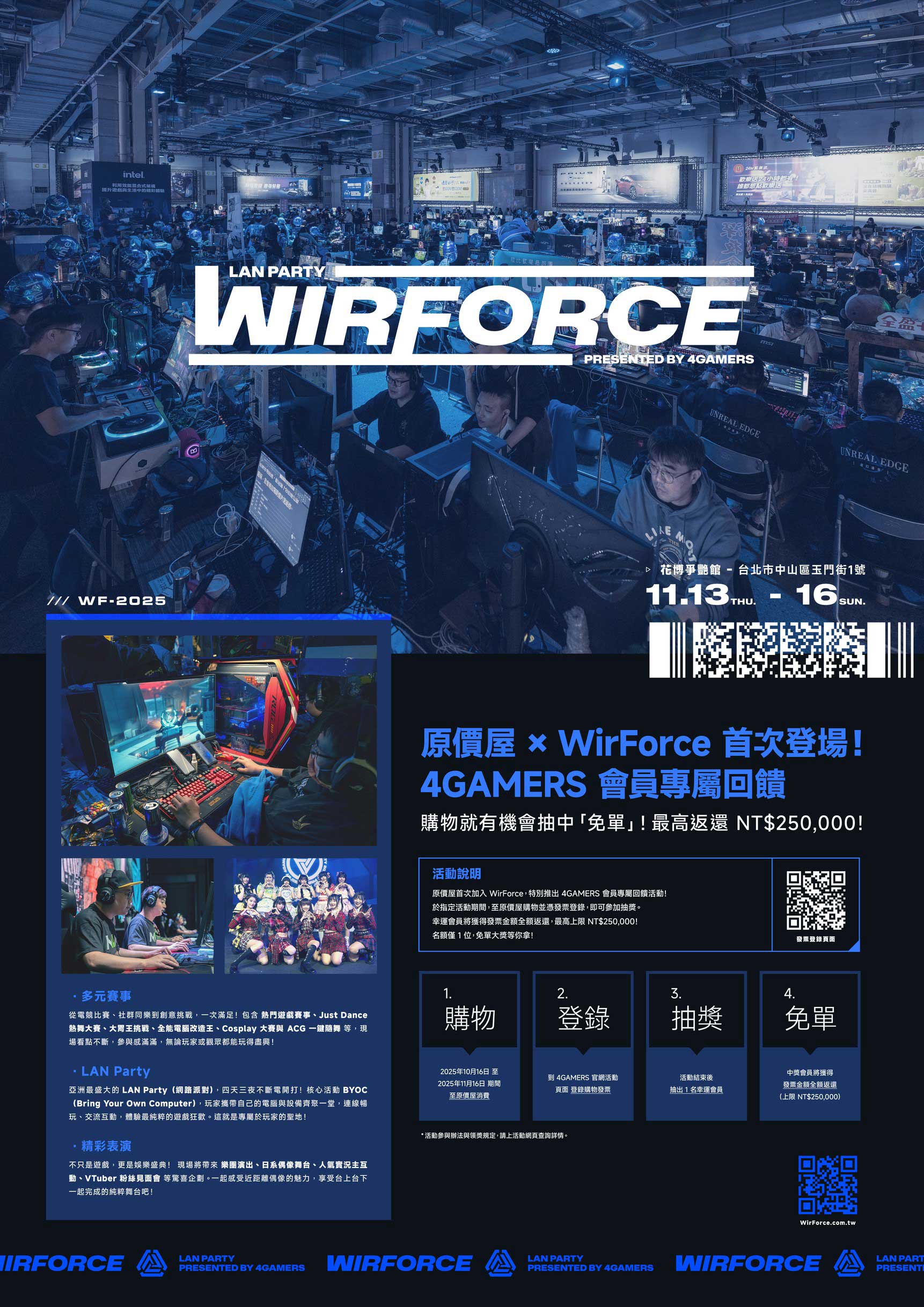 這是原價屋首次進駐WIRFORCE,為現場參與Lan Party的熱血玩家們提供電腦硬體服務和超優惠促銷活動!不得不說在現場4天3夜的BYOC玩家非常熱血呀,除了搬來自己的電腦主機、螢幕、鍵盤等的玩家之外,實況直播主、Coser和VTuber等都在這裡使出渾身解數,不分畫夜演出!WIRFORCE官方也會舉辦多樣的同樂活動,例如FF玩家社群之夜、快打旋風VI電競比賽、VTuber線下見面會、日系偶像團體演出…(更多節目表請點我)。還有華碩、技嘉、ACER、ZOTAC、美光…等眾多大品牌共襄盛舉現場展示電競火力!對了,原價屋現場支援了上百台電腦主機與零組件給BYOC、AMD/技嘉組裝大賽和ROG x FF試玩主機、官方電競比賽專用機等!當然啦,原價屋也跟現場參與的諸多品牌推出非常多限量促銷活動,技嘉筆電最高折扣五千、5060Ti竟然只要接近一萬元,TP-LINK路由器最高還折價上萬、ROG螢幕甚至折完再送五千元贈品,還有海韻、保銳、Montech、Irocks、Cherry等多樣品牌商品一起拚了!從初音套裝玩具總動員主機到板卡、電競鍵鼠、電源甚至是分享器等,基本上你都可以在現場組出一台更優惠的電腦了!對了,別忘了10月16日到11月16日以前在會場或全台原價屋門市消費的朋友們記得來這裡登錄,有機會幫你出錢免單呀!有關WIRFORCE 2025 原價屋現場促銷與全台同步促銷內容,我們也整理如下連結︰