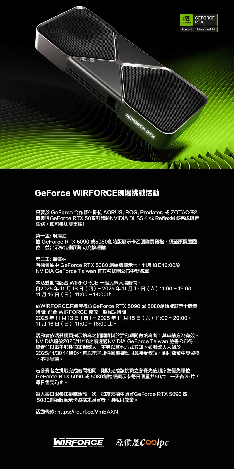 • 本活動期間配合 WIRFORCE 一般民眾入場時間,自2025 年 11 月 13 日(四)- 2025 年 11 月 15 日(六)11:00 ~ 19:00,11 月 16 日(日) 11:00 ~ 14:00止。於WIRFORCE原價屋攤位GeForce RTX 5090 或 5080創始版顯示卡購買時間: 配合 WIRFORCE 開放一般民眾時間2025 年 11 月 13 日(四)- 2025 年 11 月 15 日(六)11:00 ~ 20:00,11 月 16 日(日) 11:00 ~ 16:00 止。活動者依活動網頁指示填寫之相關資料於活動期間內填寫者,其申請方為有效。NVIDIA將於2025/11/18之前透過NVIDIA GeForce Taiwan 臉書公布得獎者並以電子郵件通知獲獎人,不另以其他方式通知。如獲獎人未能於2025/11/30 14時0分 前以電子郵件回覆確認同意接受獎項,視同放棄放棄中獎資格,不得異議。