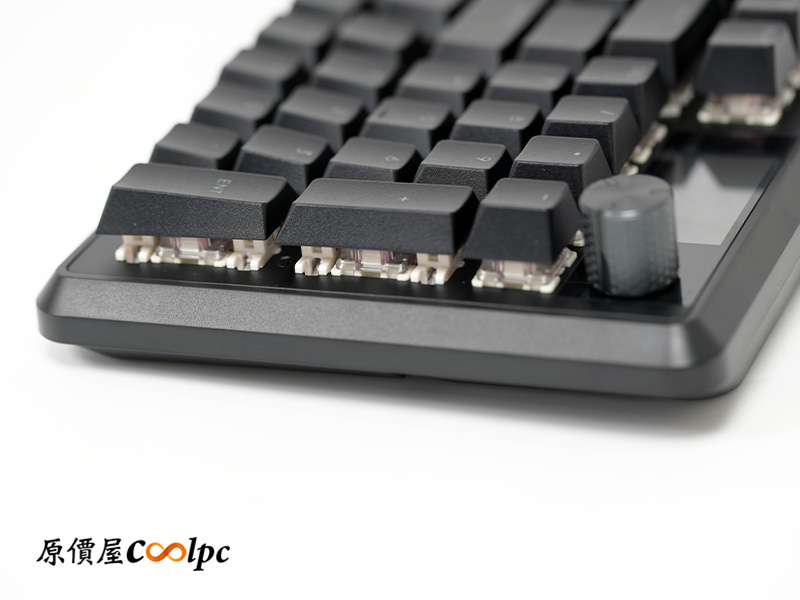 因為內部一次塞進了四層泡棉,側邊看過去會覺得整把鍵盤厚實不少,視覺感很紮實。邊緣還特別用了菱形切角來收邊,讓厚重的機身多了一份設計感,細節處理得相當到位。