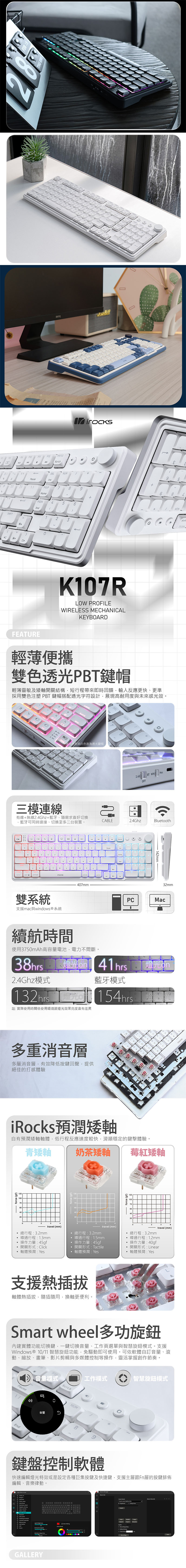 這款 K107R 的核心重點在於它採用了 i-Rocks 自有預潤矮軸,觸發行程比傳統軸體更短、反應更迅速,對於需要高頻率操作的遊戲來說,這就是領先對手的關鍵!為了對應不同手感需求,青、茶、紅三種經典手感一應俱全,鍵盤內採用多層消音結構,徹底抵消了敲擊時的雜亂聲響,換來的是更為紮實且細膩的聽感與觸感。不論是追求極致低延遲的 2.4G 模式、靈活的藍牙,或是穩定供電的有線連線,都能在 Windows 與 macOS 間流暢切換。右上角的智慧旋鈕讓調整音量或畫面縮放無比直覺,加上全鍵熱插拔的設計,即便是對手感極其挑剔的玩家也能自由更換軸體,DIY 出專屬於自己的戰鬥專武,當然啦,如果用膩了一般的機械式鍵盤,想換換新口味的話,快點趁這次活動入手,保證你用完絕對會愛不釋手喔!