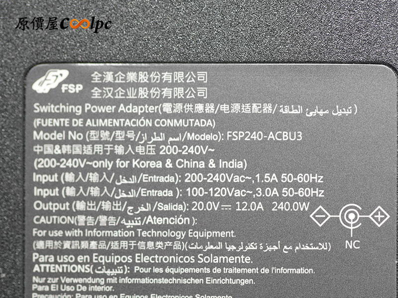 變壓器為全漢的 FSP240-ACBU3,輸出最大 20V、12A、240W,體積一般,是可以輕鬆收在背包裡的大小。