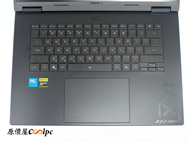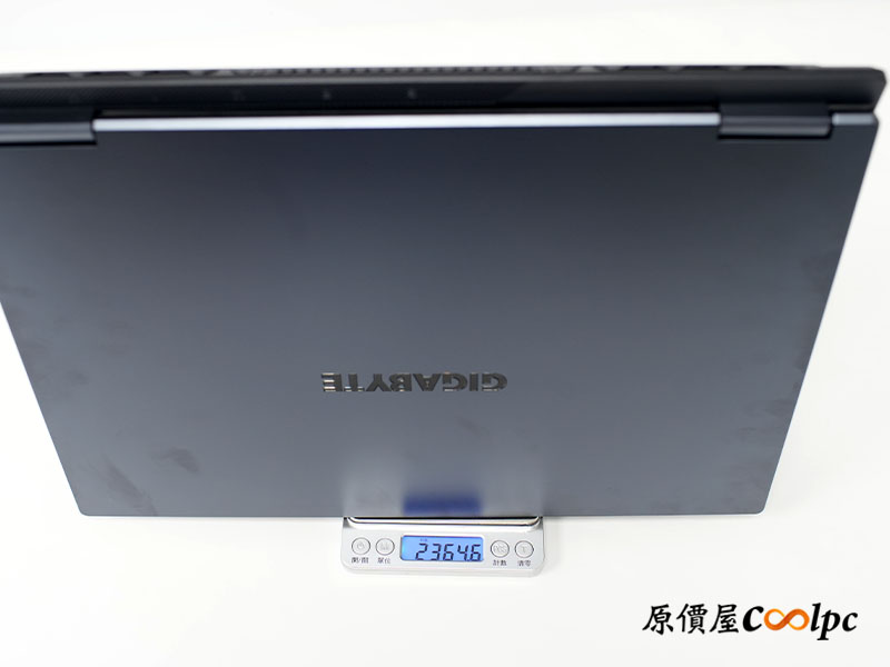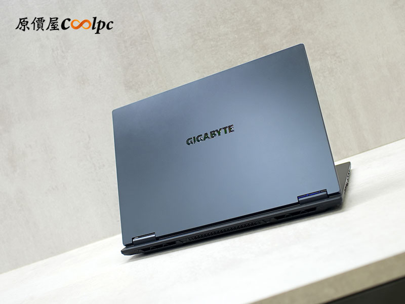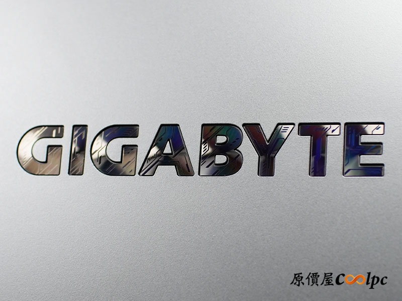 A 面採用金屬材質,整台是帥氣的鈦岩黑,質感相當不錯。不過表面會稍微吃指紋,外觀控要多注意一點。中間那個技嘉 LOGO 用的是銘刻工藝,隨著角度不同會反光變色,酷得很低調。