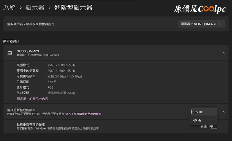 螢幕解析度是 WQXGA 2560×1600,支援 8-bit 色深,畫面細膩又飽滿。更新率最高可以開到 165Hz,也能切回 60Hz,但一般切到 165Hz 就很難回去了XD。