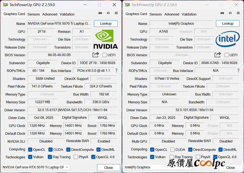 (點圖放大)CPU-Z 顯示 CPU 搭載 Intel Core 7 processor 240H 處理器(6P+4E核,16緒),內顯為 Intel Graphics 晶片,以及 NVIDIA GeForce RTX 5070 Ti Laptop GPU 12GB GDDR7 獨立顯卡。