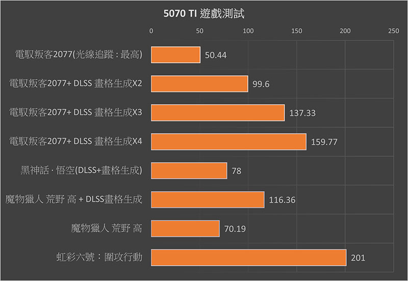 在遊戲實測部分,這台的表現真的猛!《虹彩六號:圍攻行動》直接跑出 201FPS,早就突破螢幕 165Hz 上限,誇張到不行!再來是顯卡殺手《電馭叛客 2077》,在 2K 光追最高畫質下也有 50FPS,開啟 DLSS 劃格生成後更是狂飆到 159FPS,幾乎貼著螢幕刷新率上限跑。《黑神話:悟空》平均約 78FPS,順順打完全沒問題。至於大家最怕優化翻車的《魔物獵人:荒野》,高畫質下就有 70FPS,開啟劃格生成後直接衝到 116FPS!整體來說不管是 FPS 射擊還是 3A 大作,這台都能暢玩沒壓力。