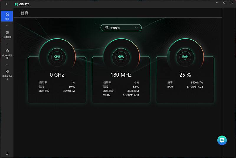 另外這台筆電也內建技嘉自家開發的 GiMATE 軟體,首頁就是效能模式切換區,總共有五種模式可以選:平衡、遊戲、創作、省電、會議。像是打遊戲就直接開「遊戲模式」,風扇跟效能會全力輸出;要剪片或修圖就換「創作模式」;開會或外出時想安靜一點,也能切到「會議」或「省電」模式,一鍵切換超方便。