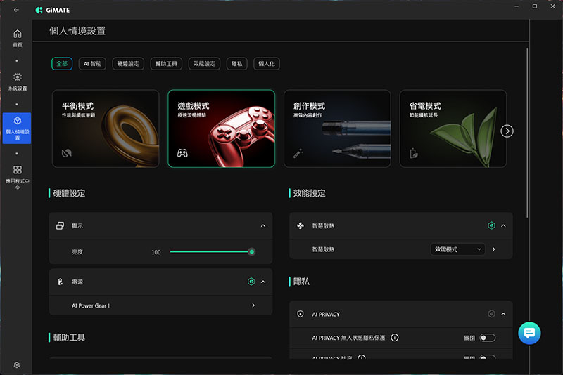 在 個人情境設定 裡面,你會看到 AI 智能、硬體設定、輔助工具、效能設定、連線控制、隱私、個人化這幾個選項,在這邊就是讓你把五種效能模式(平衡、遊戲、創作、省電、會議)裡面的細節都調整到自己想要的狀態,不管是風扇轉速、效能輸出還是燈光、網路優先等,都能自己掌控。