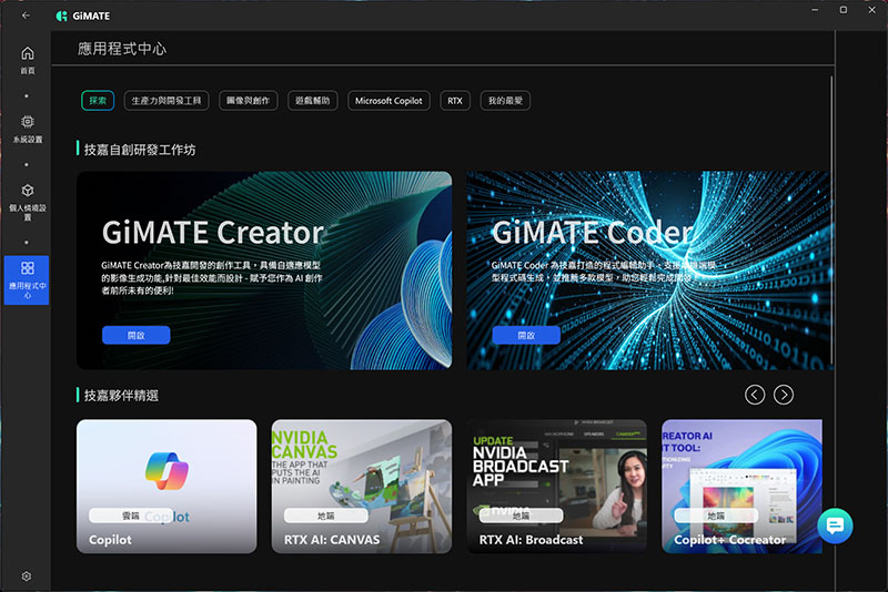 在應用程式中心裡,技嘉把市面上主流的 AI 開發工具都集中在這邊了,像是 Copilt、RTX AI : Canvas / Broadcast、NVIDIA Nim、Intel AI Assistant Builder 等,從生產力、圖文創作、再到遊戲輔助一應俱全!最上面兩款是技嘉自行開發的 CiMATE Creator 和 CiMATE Coder,一個是文生圖創作工具,一個是程式編輯助手,碼農也能靠它提升效率,這也說明這台筆電不只是拿來打遊戲,創造力、工作力它也很拿手!