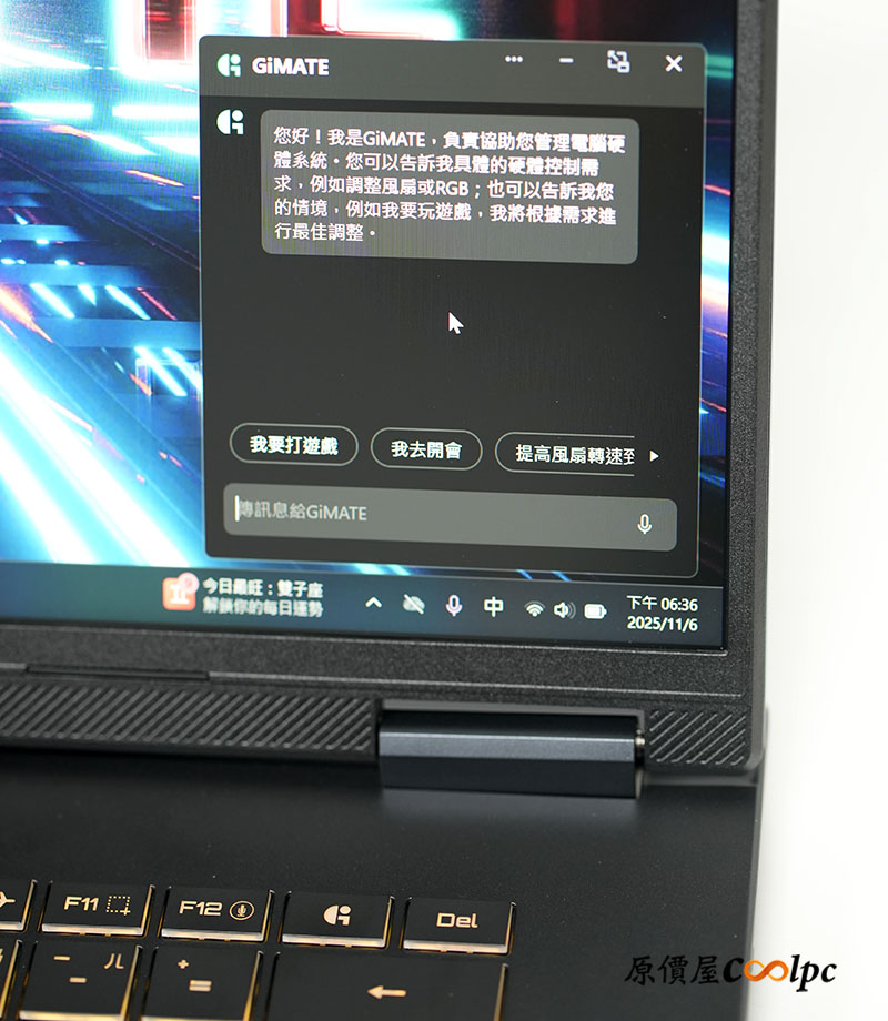 鍵盤右上角還藏了一顆 GiMATE 快捷鍵,一按下去就會跳出對話視窗。你可以直接講話或打字告訴它想幹嘛,像是要開遊戲、調效能、換燈效都行!GiMATE 會立刻幫你設定好,超直覺又方便~