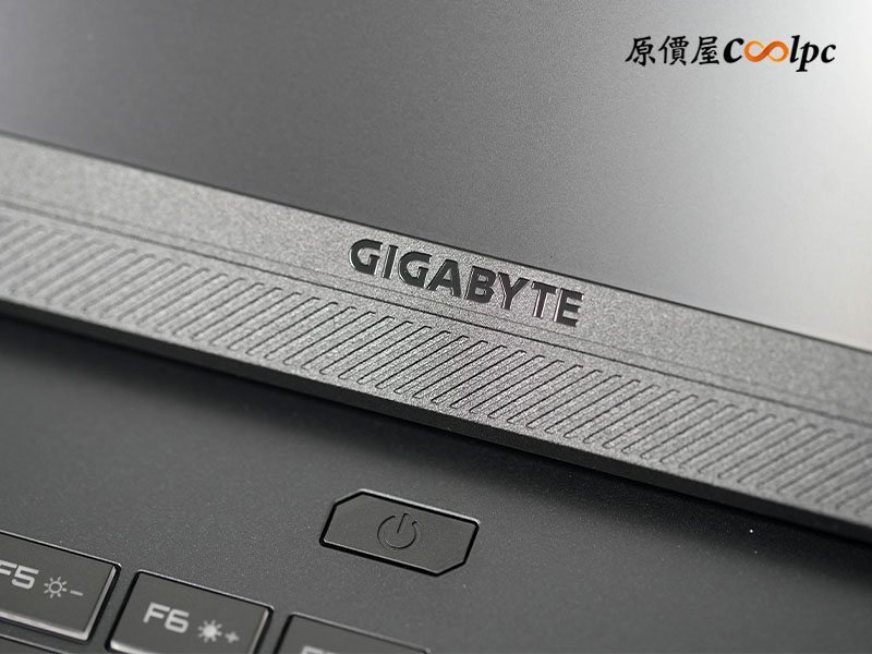 A 面採用金屬材質,整台是帥氣的鈦岩黑,質感相當不錯。不過表面會稍微吃指紋,外觀控要多注意一點。中間那個技嘉 LOGO 用的是銘刻工藝,隨著角度不同會反光變色,酷得很低調。