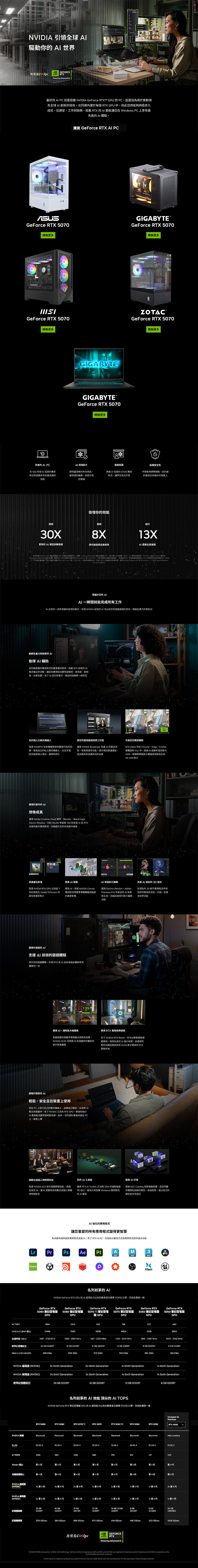NVIDIA GeForce RTX 5070 Ti 顯示卡以高達 1406 TOPS 的旗艦級 AI 算力,GeForce RTX 5070 顯示卡則具備 988 TOPS 的卓越效能,完美支援中小型語言模型 (LLM) 與多模態 AI 應用,成為熱衷電競的玩家、高效創作的設計師,以及資料科學與工程模擬專業人士的理想選擇。同時,NVIDIA GeForce RTX 5070 筆電 GPU 擁有高達 798 TOPS 的 AI 運算能力,提供便攜式 AI 推理與遊戲優化,隨時展開創作。NVIDIA GeForce RTX 50 系列是 AI 深度學習、設計與建模的核心工具,在 SOLIDWORKS 中提供順暢的互動式渲染,輕鬆處理大型、複雜的 3D 設計專案;在 MATLAB 與 ANSYS Discovery 中加速複雜模擬任務;並透過 Enscape 實現建築設計的即時視覺化。無論是工程、建築、電腦科學、資料科學或經濟領域,NVIDIA GeForce RTX 50 系列產品以卓越的 AI 算力與穩定表現,引領未來科技新境界!
