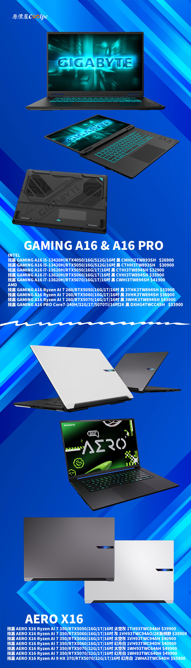 不論是沉浸於 3A 遊戲大作、執行高生產力創作,甚至是運行生成式 AI 應用,都需要強大的 NVIDIA GeForce RTX 顯卡為您提供極致效能!今天為大家帶來技嘉兩款 16 吋筆電系列為 GAMING A16 / A16 Pro 與 AERO X16。GAMING A16 & A16 Pro 系列專為遊戲玩家打造,搭載 165Hz 高刷新率螢幕,外觀採用硬派風格設計。為了駕馭強大效能,散熱系統絕不馬虎,因此機身更顯扎實穩重。處理器方面提供 Intel 與 AMD 多核心版本供選擇。AERO X16 系列則鎖定創作者需求,螢幕卓越的色彩經過預先校準,開機即可體驗豐富細節的色彩,擁有高質感外觀與僅 1.9 kg 的輕巧機身,便於外出攜帶。核心規格搭載 AMD Ryzen AI 處理器,記憶體標配 16GB,若有更高工作需求亦可選擇 32GB 版本。兩大系列顯卡皆搭載 NVIDIA GeForce RTX 40/50 系列,您可以根據預算或使用需求靈活挑選。並且還有獨家的 GiMATE AI 夥伴,讓你可以使用開源的 LLM 和文生圖等 AI 應用。