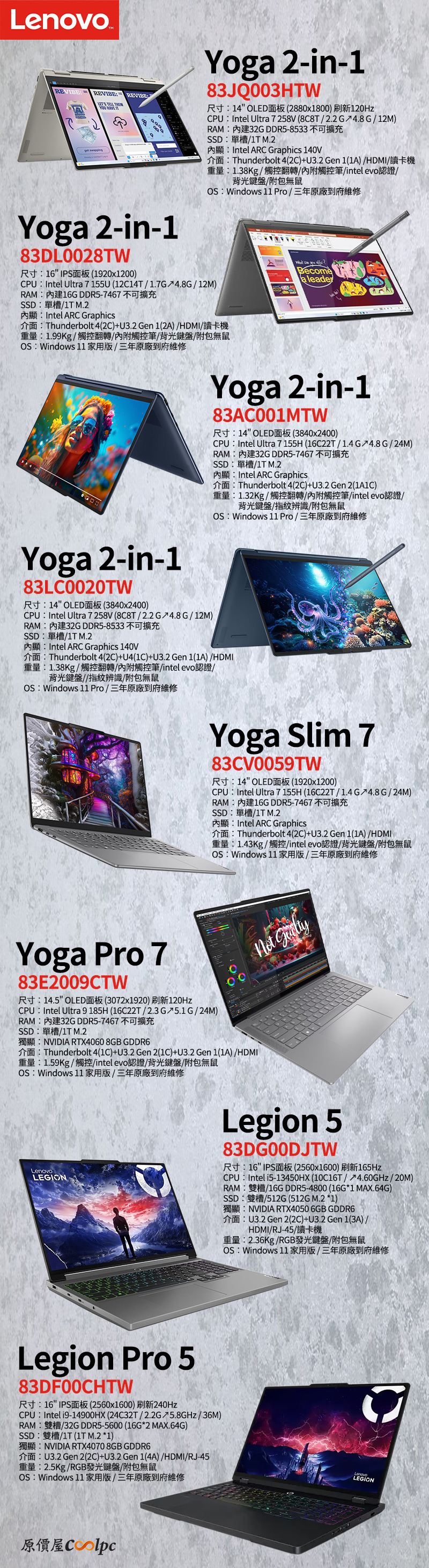 要說最靈活全面的就屬Lenovo Yoga 2-in-1系列(83JQ003HTW、83DL0028TW、83AC001MTW、83LC0020TW),他們都具備觸控翻轉設計,有筆電、平板、帳篷三種模式,能夠應付各式各樣的使用狀況,常用的筆電模式做文書報告沒問題,平板模式則是能藉由觸控直覺操作,搭配觸控筆要手寫筆記或簡易繪圖設計也行,直立握持閱讀電子書都方便。帳篷模式方便展示簡報或圖表、廣告文宣,且佔用的空間更少,更能適應不同使用環境。而且搭載Intel Core Ultra 7系列AI處理器,透過AI分配效能更有效率,部分型號還使用OLED螢幕,整體更輕薄有型了。而要輕薄攜帶方便的話還有Lenovo Yoga Slim 7(83CV0059TW)、Yoga Pro 7(83E2009CTW),都是OLED面板減少螢幕厚度,重量分別僅有1.43KG、1.59KG,且通過 Intel EVO認證,對於效能、續航、充電效率都有一定水準,後者還多了RTX4060 8GB顯示卡,效能更上一層樓。最後Legion 5(83DG00DJTW)與Legion 5 Pro(83DF00CHTW)則是玩樂與工作一台搞定,使用Intel i5/i9效能型處理器,顯卡也是搭配RTX4050 6GB/ RTX4070 8GB,16″ WQXGA(2560 x 1600)解析度下能提供165Hz/240Hz高刷新率,細膩且順暢的畫面完美滿足遊戲需要,16:10的畫面也是創作者的黃金比例,結合出色的硬體效能,要跑繪圖影片後製都游刃有餘。