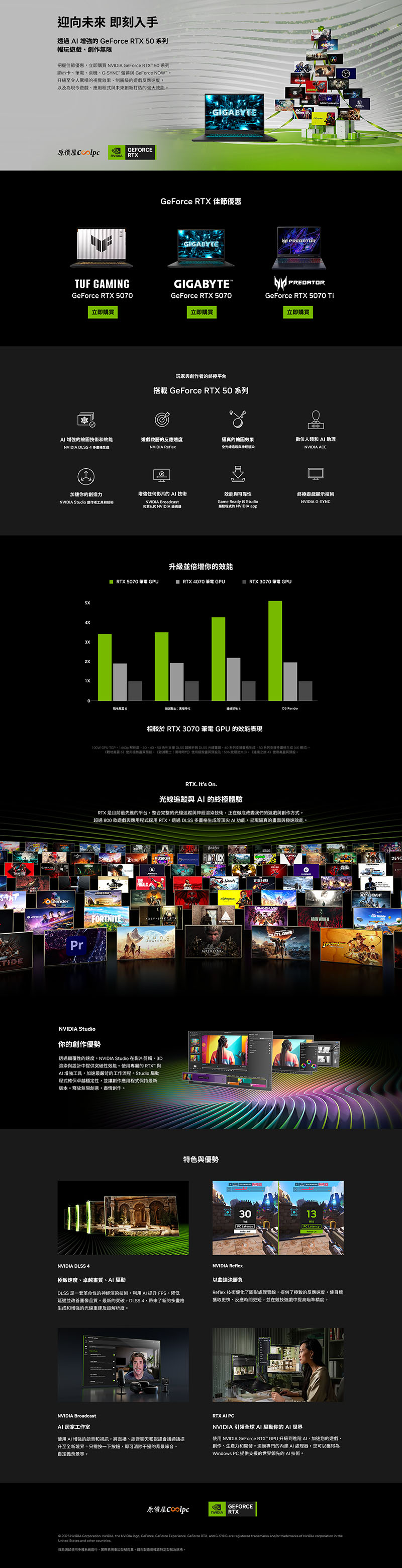 同時讓你享受遊戲領域的 NVIDIA DLSS AI 技術,搭載 GeForce RTX 50 系列產品的玩家可以透過 DLSS 4 的「超高解析度」與「多畫格生成」技術,將 FPS 提升最高可達 8 倍,在包括 《AION2》、《戰地風雲 6》、《燕雲十六聲》、《NBA 2K26》、《浩劫殺陣2:車諾比之心》、《闇龍紀元:紗障守護者》、《印第安納瓊斯:古老之圈》、《宣誓》、《光與影:33 號遠征隊》、《明末:淵虛之羽》、《黑神話:悟空》、《電馭叛客 2077》、《心靈殺手 2》等超過 100 款遊戲中,都能呈現頂級畫質、流暢的 FPS 表現與逼真的光影效果!光線重建技術在《心靈殺手 2》遊戲大作下尤其出色,全光線追蹤技術為幽暗場景賦予逼真細膩的光影與反射效果,卓越的深度及真實感,為玩家帶來更加身臨其境的沉浸體驗。此外,NVIDIA Reflex 技術透過最佳化顯示卡與 CPU 的渲染同步,大幅降低系統延遲,提升競技遊戲的反應速度,讓玩家在《戰地風雲 6》、《特戰英豪》、《Apex 英雄》等遊戲中獲得更快的目標鎖定與精準瞄準。轉戰到創作者應用,NVIDIA Studio 結合 RTX GPU 效能與 AI 加速技術,影片編輯更快、3D 渲染更流暢,直播也順暢無礙,沒有限制、沒有延遲,您完全可盡情揮灑創意。還有 NVIDIA Studio 專屬驅動程式,加速創作應用程式表現。Adobe Premiere Pro 可透過GeForce GPU, 強化影音編輯流程,加速影片轉場,特效隨選即用。NVIDIA Studio 讓創作者應用程式速度猶如風馳電掣,讓您創作和工作的速度更勝以往。而目前最熱門的開源文本生圖應用當屬 Stable Diffusion 模型,透過 ComfyUI 介面簡易輸入提示詞後立即生成影像,若要短時間內生成大量影像進行篩選,第五代 Tensor 核心的 NVIDIA GeForce RTX 50 系列產品是 AI 工作者的首選。AI 應用還有針對會議視訊最佳化的 NVIDIA Broadcast 應用程式:可將任何空間變成居家工作室,能運用 AI 一鍵消除背景雜音與空間回音、虛擬背景(替換、刪除、模糊)、視訊雜訊消除、自動取景、眼神接觸,不論鏡頭中的您如何移動或眼神飄移,AI 皆能即刻動態追蹤,讓您始終保持鏡頭中的 C 位,讓這場視訊會議和直播畫面更加專業與自然,最棒的是 GeForce RTX 用戶可免費下載!特別值得一提的是全新驅動層級的 AI 模型:Smooth Motion,這項創新為《原神》、《沉默之丘》等遊戲帶來額外畫格推論,讓鎖幀更流暢,沉浸感大幅提升。STEM 學習方面,NVIDIA 首屈一指的 AI 技術與強大的 GPU 可加速工程、建築、電腦科學、資料科學、經濟等領域的頂尖學生應用。GeForce RTX 筆電以輕薄的設計提供卓越的電池續航力,讓學生能走出電腦室,隨處工作、更快速地完成課業,並在同一部筆電上學習、創作與娛樂。正在修習工程或建築課程嗎?GPU 已成為設計、建模,以及模擬元件、系統和結構的基本工具。在 SOLIDWORKS 中運用順暢的互動式渲染技術處理更大型、更具挑戰性的 3D 設計專案、利用 MATLAB 和 ANSYS Discovery 加快完成複雜的模擬工作,並使用 Enscape 將您的建築傑作即時視覺化。有了 GeForce RTX 50 系列筆記型電腦,您就知道自己擁有了適合工作的工具。