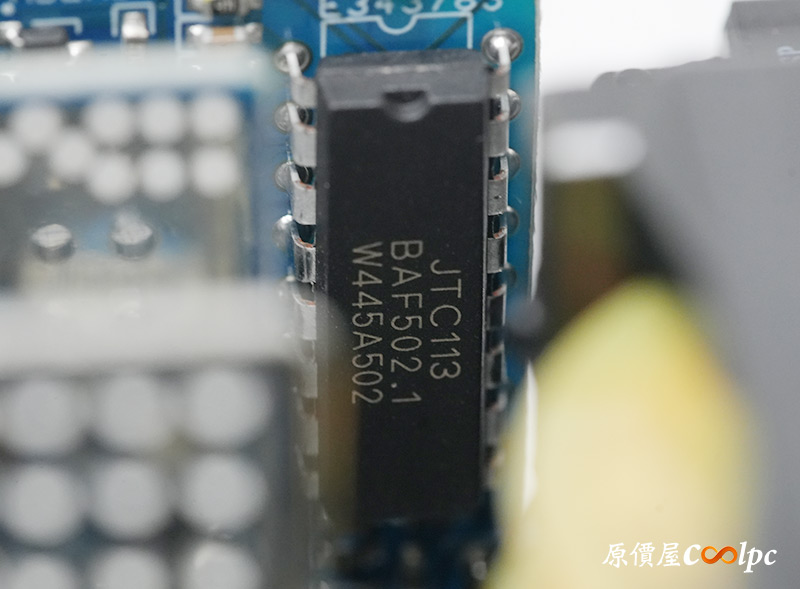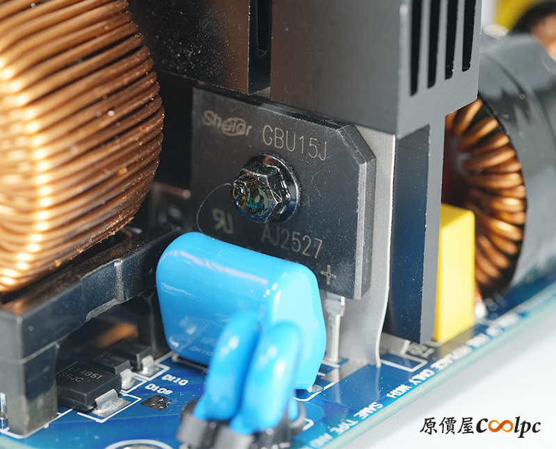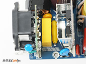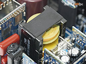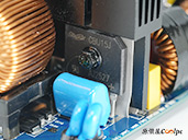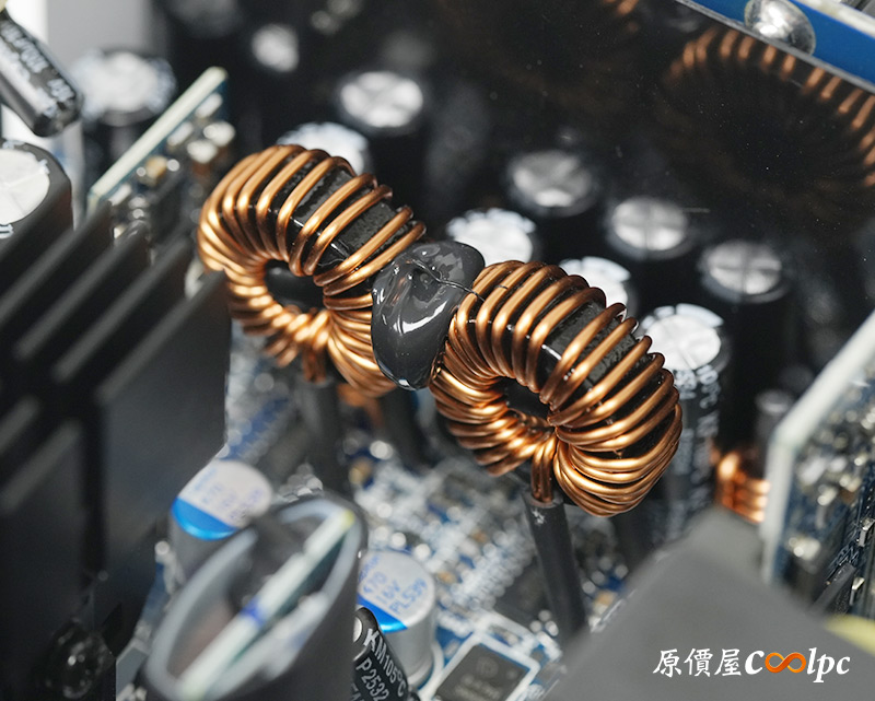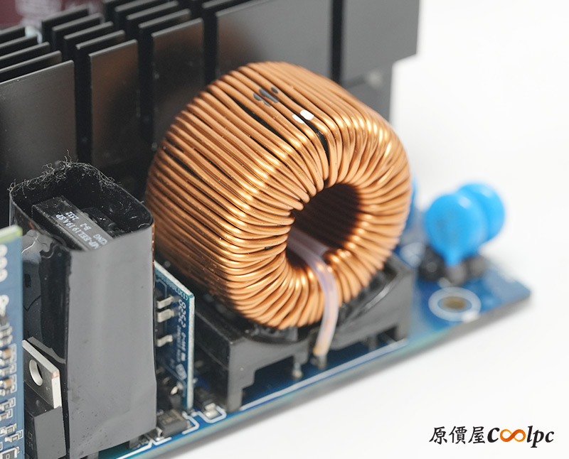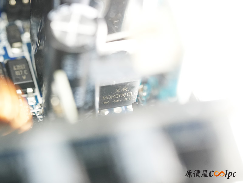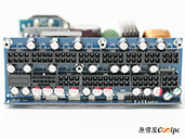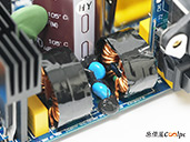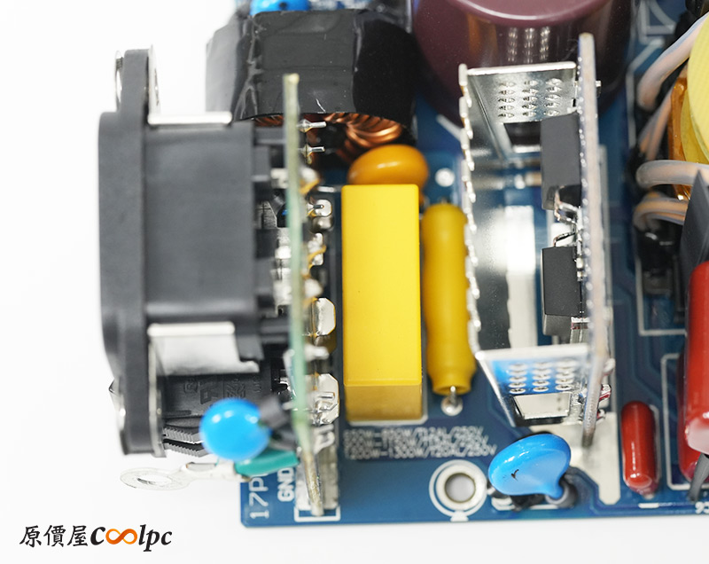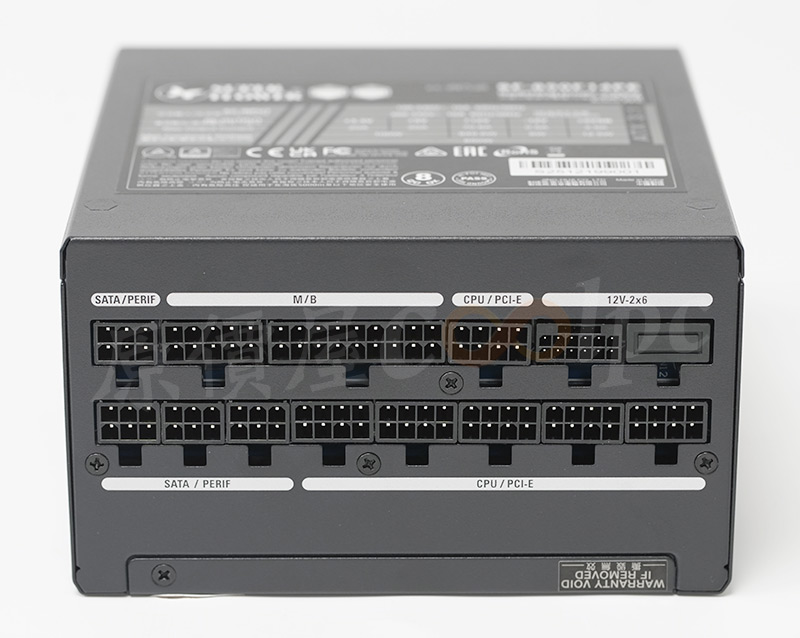 直接看模組化輸出端這邊,插槽功能都有標示加上防呆設計,看得出來12V-2×6有預留一個插槽空間,但猜測是因為這顆LEADEX III最多就850W輸出,多做也不會真的讓總輸出上升,看來只有更大瓦數的版本有機會用上它了。