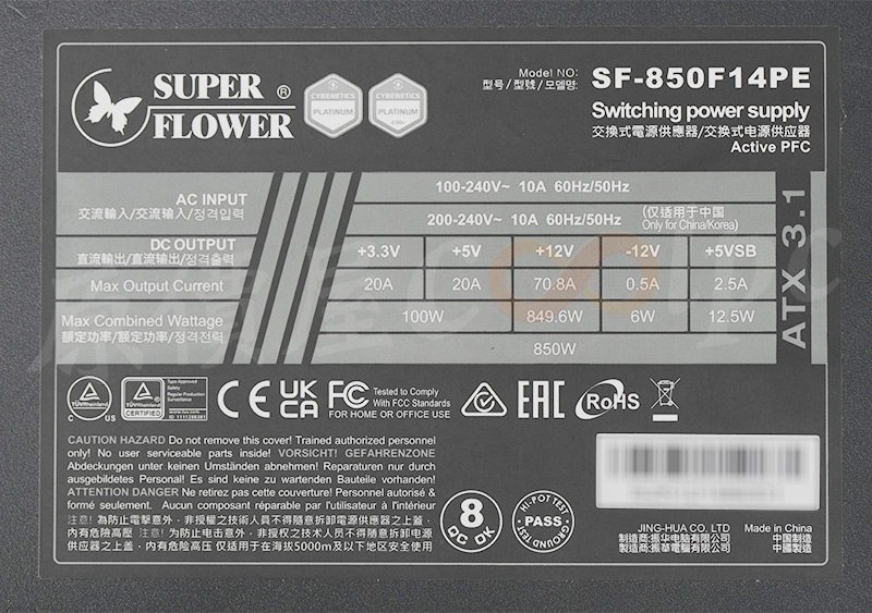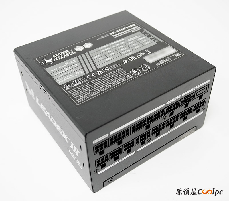 背面可以找到電源轉換功率表,LEADEX III 850W支援100-240V國際電壓,在+3.3V/+5V時提供20A 100W,+12V時提供70.8A 849.6W,總輸出850W。