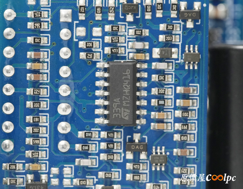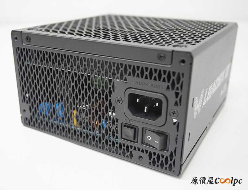 散熱搭配一顆14cm H.D.B.軸承智慧溫控靜音風扇,可以透過電源上的實體按鈕切換到ECO模式,低負載狀態會自動停轉減少噪音,電源外殼上有密集的幾何外殼散熱孔,氣流進出基本上暢行無阻。